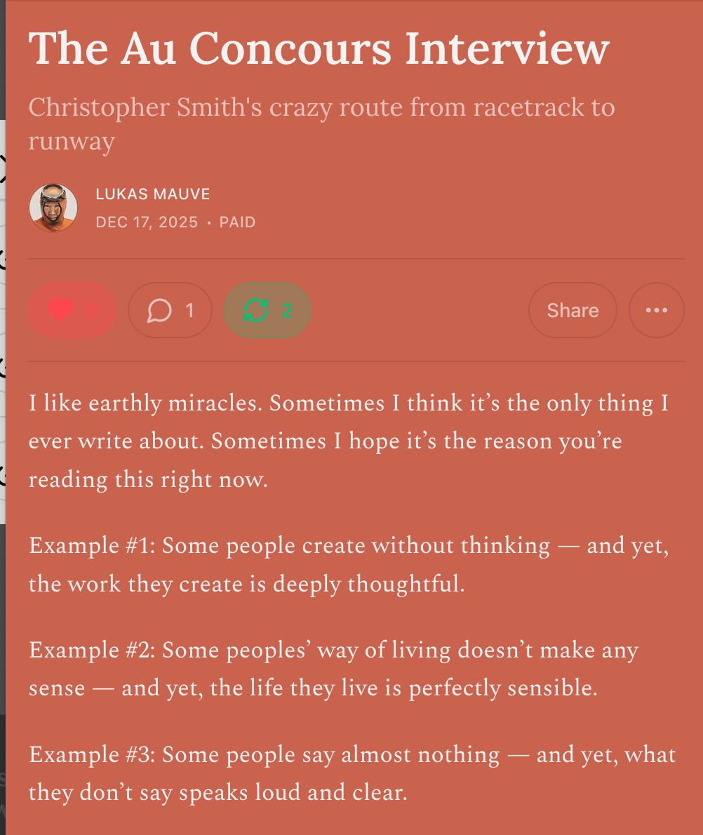"But small isn’t the right word for Au Concours. It’s not small for smallness’ sake. It’s the kind of small that hasn’t grown big yet. That exciting feeling of potential, of coming-to-be, of what’s-to-come, of nearly-there has much to do with its founder Christopher Smith, who at 33 has already lived two or three lives on different sides of the globe."