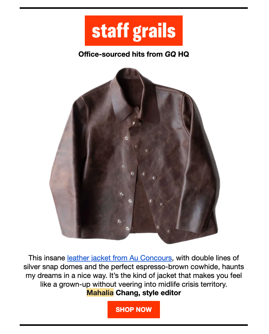 GQ - This insane leather jacket from Au Concours, with double lines of silver snap domes and the perfect espresso-brown cowhide, haunts my dreams in a nice way. It’s the kind of jacket that makes you feel like a grown-up without veering into midlife crisis territory.